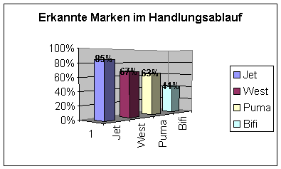 Neben der Jet-Tankstelle mit 85 Prozent, wiesen die Zigarettenmarke West Wiedererkennungswerte mit 67 Prozent, die Sportartikelfirma Puma mit 63 Prozent und die Marke Bifi mit 41 Prozent auf. Vor allem letztere Marken verzeichnen deutlich niedrigere Werte, welche auf die Schwierigkeit der bestmöglichen filmtechnischen Umsetzung zurückzuführen sind.