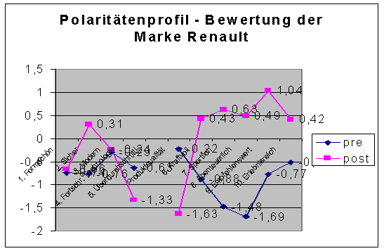 Nach den Ergebnissen der Voruntersuchung schienen sich die bereits als positiv eingestuften Philips-Produkte als positive Qualitätsprodukte weiter verstärkt zu haben. Die Kategorienwerte lauten: "traditionell" (vorher 0,12/nachher 0,16), "zuverlässig" (vorher 1,08/nachher 1,65), "innovativ" (vorher 0,31/nachher –0,22), "progressiv" (vorher 0,16/nachher 0,04), "preiswert" (vorher –0,27/ nachher 0,18), "qualitativ hochwertig" (vorher 1,15/nachher 1,78), "überlegene Technologie" (vorher und nachher 0,86), "kompetent" (vorher 0,95/nachher 0,74), "angenehm" (vorher 0,48/nachher 0,4) und "interessant" (vorher 0,4/nachher 1,1). Doch die nur geringfügige Imageverbesserung kann darauf zurückgeführt werden, dass bis auf zwei Philips-Produkte die meisten platzierten Produkte keinen besonders großen Handlungsbezug aufwiesen, und sogar nicht einmal von den Testpersonen richtig erkannt werden konnten.[??]