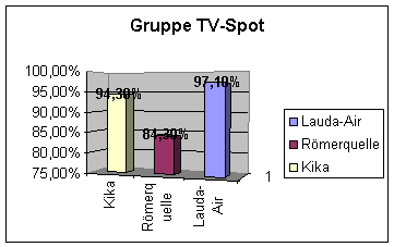 Besonders hohe Wiedererkennungswerte weisen bei der Gruppe TV-Spot Lauda-Air mit 97,10 Prozent und Kika mit 94,30 Prozent auf. Dahinter rangiert Römerquelle mit 84,30 Prozent. Am besten gefiel den Testpersonen der Werbespot der Römerquelle, die mit 70 Prozent den höchsten Wert aufweist, Lauda-Air wurde von 20 Prozent als bester Werbespot im Vergleich zu den anderen gezeigten, angegeben. Kika schnitt hingegen mit 10 Prozent am schlechtesten ab, weil es sich in erster Linie um eine reine Produkt-Werbung handelte und als aufdringlich und aggressiv von den Testpersonen empfunden wurde.